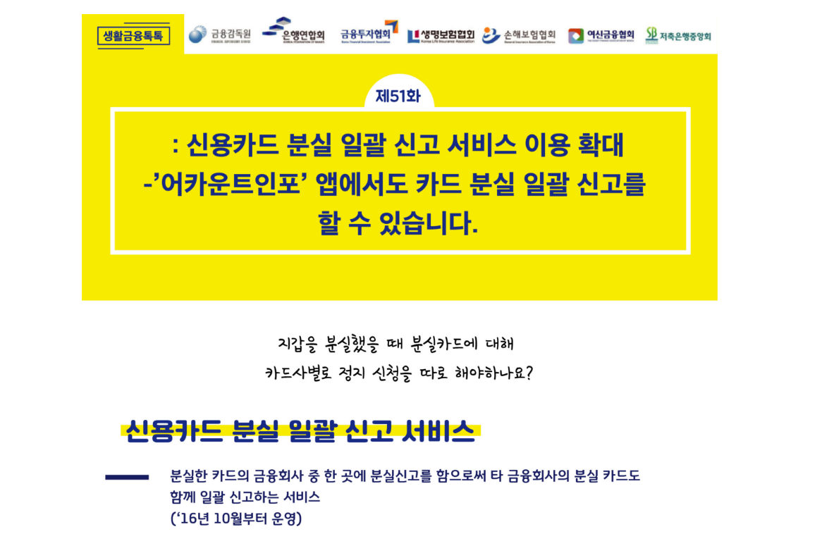 어카운트인포에서는 숨은돈 찾기 뿐만 아니라 카드 분실신고도 일괄적으로 신고할 수 있습니다.